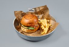 465 г • Булочка бриошь, куриная котлета в хрустящей панировке, соус ранч, соус баффало, плавленный сыр чеддер, малосольный огурец, томат, салат ромен, картофель фри