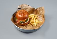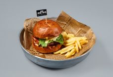 435 г • Булочка бриошь, котлета из говядины, острый соус, соус бургер, бекон, плавленный сыр чеддер, луковый джем, маринованый огурец, томат, салат ромен, картофель фри