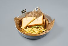 430 г • Хлеб сэндвичный, куриное филе, жареное яйцо, бекон, плавленный сыр чеддер, малосольный огурец, томат, салат ромен, соус ранч, соус тартар, картофель фри, зелень