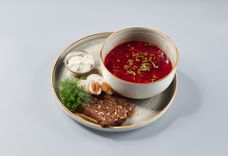 440 г • Говяжий бульон, говядина, свекла, морковь, лук, картофель, томатная паста, чеснок, ржаной хлеб, грудинка, зелень, сметана