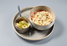 365 г • Рыбный бульон, лосось, картфель, лук, морковь, сельдерей, сливочный сыр, сливки, чеснок, гренки, зелень